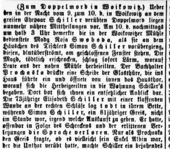 O dvojnásobné vraždě spáchané v noci z 9. na 10. t. m. na starém manželském páru Schillerových máme nyní bližší sdělení. 10. t. m. o půl třetí odpoledne spatřila služebná Rosa Swoboda zaměstnaná ve vojkovickém mlýně, když procházela okolo domku stolaře Schillera, jak u zavřeného okna stojí stolař celý pokrytý krví. K smrti vylekaná služebná, okamžitě způsobila povyk, načež přiběhli lidé z blízkého mlýna. Účetní Prochaska rozbil skleněnou výplň dveří, které vedly do domu, a otevřel zevnitř vrata do domu, načež se přítomní vydali do bytu Schillerových. Tam se jim naskytl strašlivý pohled. 73letá Elisabeth Schiller ležela s rozevřenou ránou na pravém spánku mrtvá ve své posteli, zatímco Simon Schiller, 81letý stařec, nebyl schopen podat jakékoli vysvětlení. Očividně v důsledku prožité hrůzy a utržených zranění ztratil řeč. Jen, když se starce Prochaska zeptal, jestli to možná nespáchal jejich vnuk Albin, dal Schiller souhlasné znamení. Brzy na to ztratil stařec vědomí, a na následky svých zranění, které mu způsobil jeho vlastní vnuk dřevěnou motykou, v noci zemřel. Vrah evidentně nejdříve zavraždil svoji babičku, a teprve potom přepadl dědu, který byl těžce nedoslýchavý, neslyšel hluk zápasu, a klidně spal ve své posteli. Motivem činu byla pomsta za to, že manželé Schillerovi tohoto chlapečka vyhýbajícího se práci už déle u sebe nechtěli mít. Vrah neukradl nic, jen si převlékl své lepší šaty a utekl. Naposled byl Albin Schiller viděn 9 t. m. v 6 hodin večer jedním mlynářským pomocníkem.